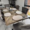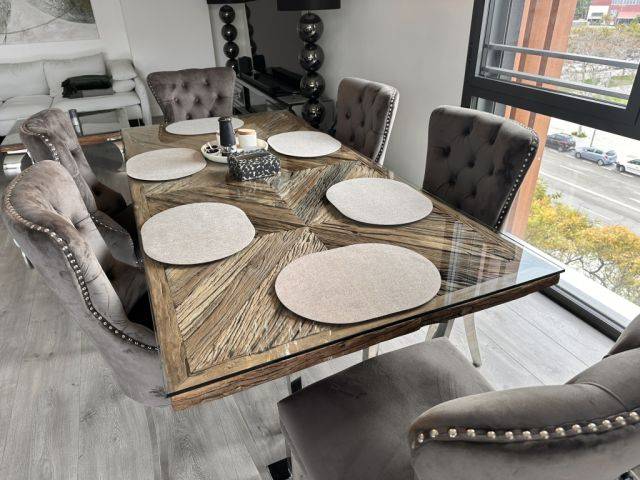 Der Tisch ist aus massivem Holz gefertigt und hat eine elegante Glasabdeckung. Die Tischbeine sind aus stabilem Eisen. Sehr robust und langlebig.