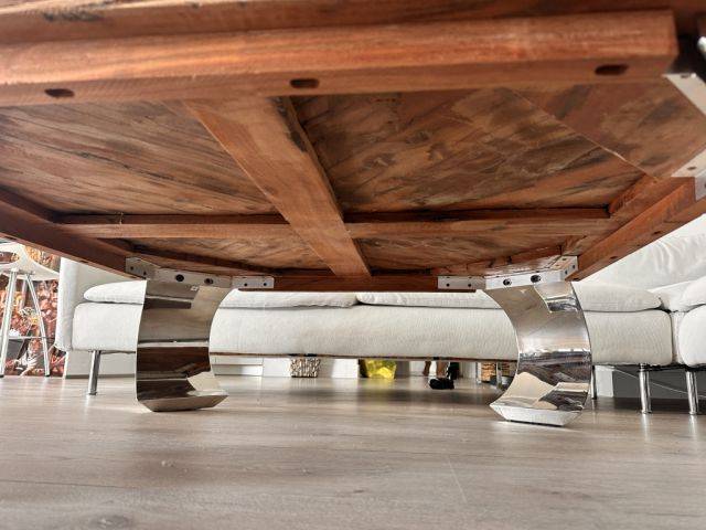 Der Tisch besteht aus massivem Holz mit einer eleganten Glasplatte. Die Füße sind aus stabilem Eisen gefertigt und geben dem Tisch ein modernes, exklusives Design. Sehr robust und langlebig.