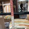 Enthält 6 passende Stühle mit heller Holzstruktur und originaler Samtpolsterung mit Streifen in warmen Tönen (Orange, Grün und Beige), die dem Set eine Retro- und gemütliche Atmosphäre verleihen.