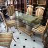 Eleganter Esstisch mit dicker und abgeschrägter Glasplatte, der auf einem soliden dekorativen Sockel im klassischen Stil in Creme- und Goldtönen ruht.