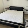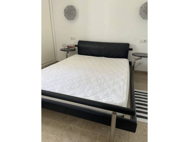 1 ital. Designer-Bett, Holz schwarz mit schwarzem Leder-Kopfteil, mit dazugehörigen runden Ablageflächen links und rechts, die man anschrauben oder weglassen und drehen kann - mit Tempur Matratze und Matratzen-Auflage (Baumwolle)!