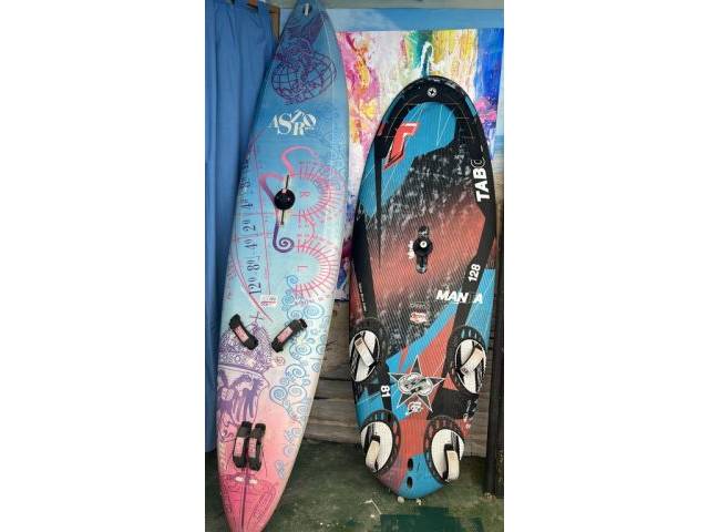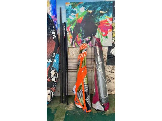 Es handelt sich um 2 komplette Ausrüstungen,2 Bretter - 2 Masten, 2 Gabeln, 2 Segel, 2 Mastfüße,